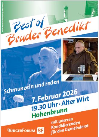 Am 07. Februar um 19.30 Uhr im Alten Wirt ist es soweit: Seit 10 Jahren spießt Tilo Hoffmann alias Bruder Benedikt in seiner Fastenpredigt Merk- und Denkwürdiges aus dem Gemeindeleben von Hohenbrunn auf. In dieser kurzweiligen Revue wird er die Highlights aus den Fastenpredigten der vergangenen Jahre zum besten geben. Natürlich werden auch aktuelle Ereignisse mit aufgegriffen. Schmunzeln und lachen Sie mit uns, und vielleicht werden wir alle feststellen, dass sich offenbar manche Dinge nie ändern in Hohenbrunn… Im Anschluss daran können Sie mit unseren Kandidierenden für den Gemeinderat ins Gespräch kommen.